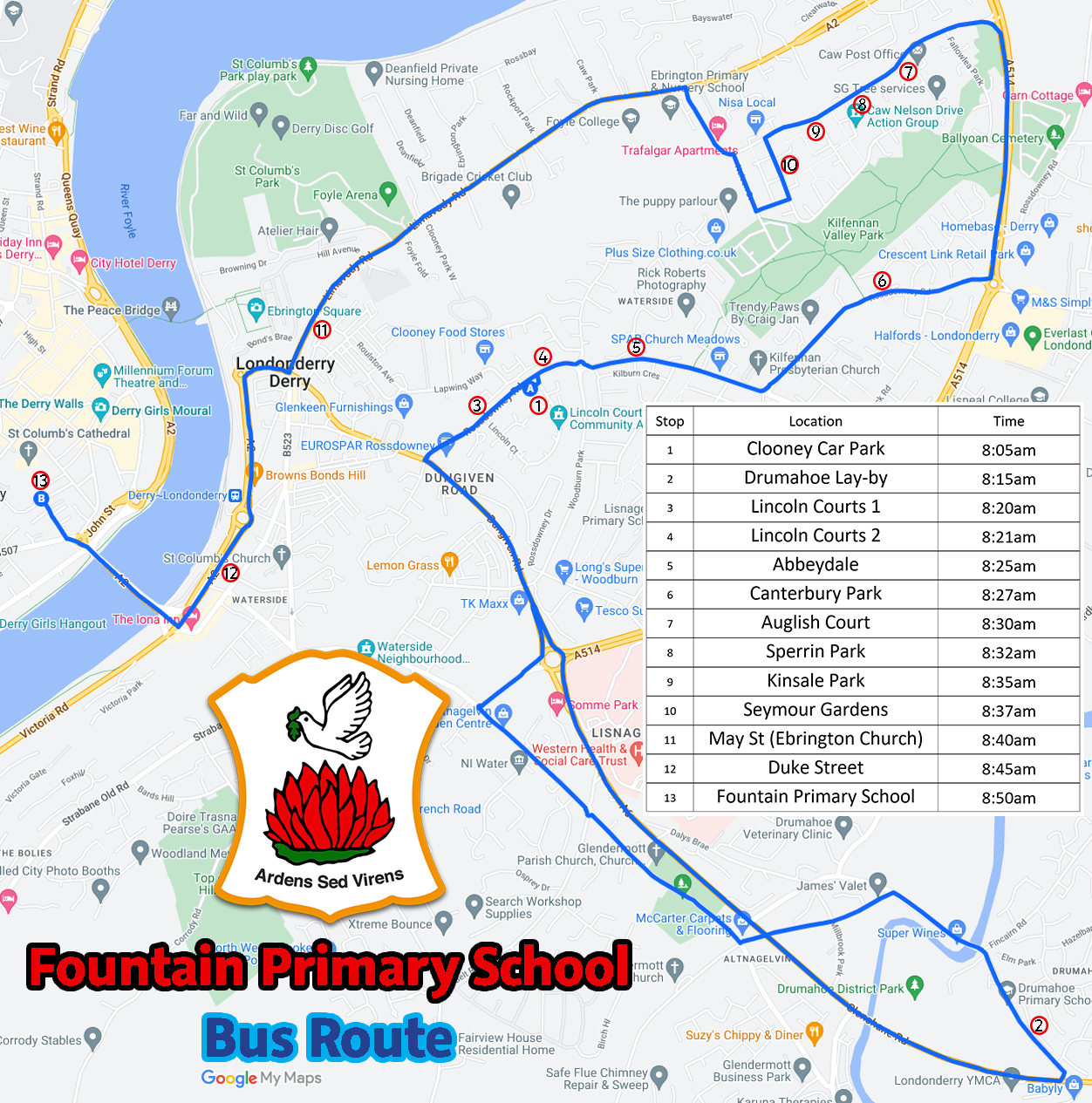 Our current bus route can be accessed on Google Maps at the link here. Alternatively, you can look at the map or download the PDF below.