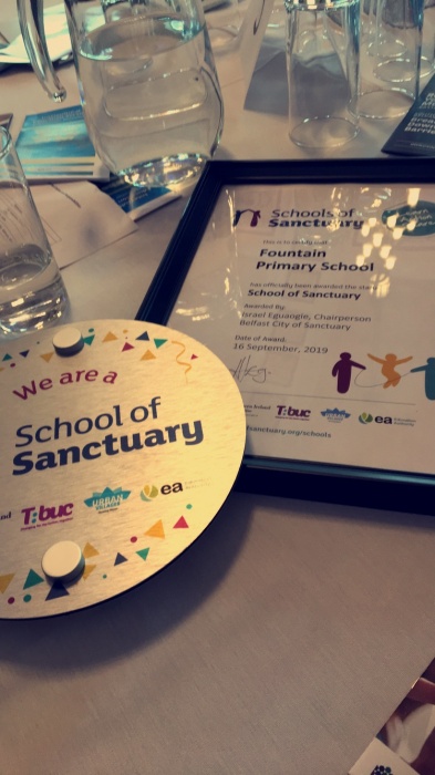 The School of Sanctuary award is presented to schools who have worked with the Urban Villages Initiative, the Education Authority and the City of Sanctuary Group in order to make themselves welcoming places for all pupils and their families, where every child feels safe and where they are fully accepted.