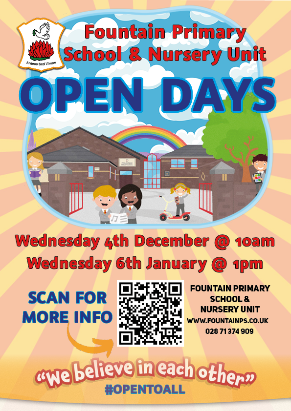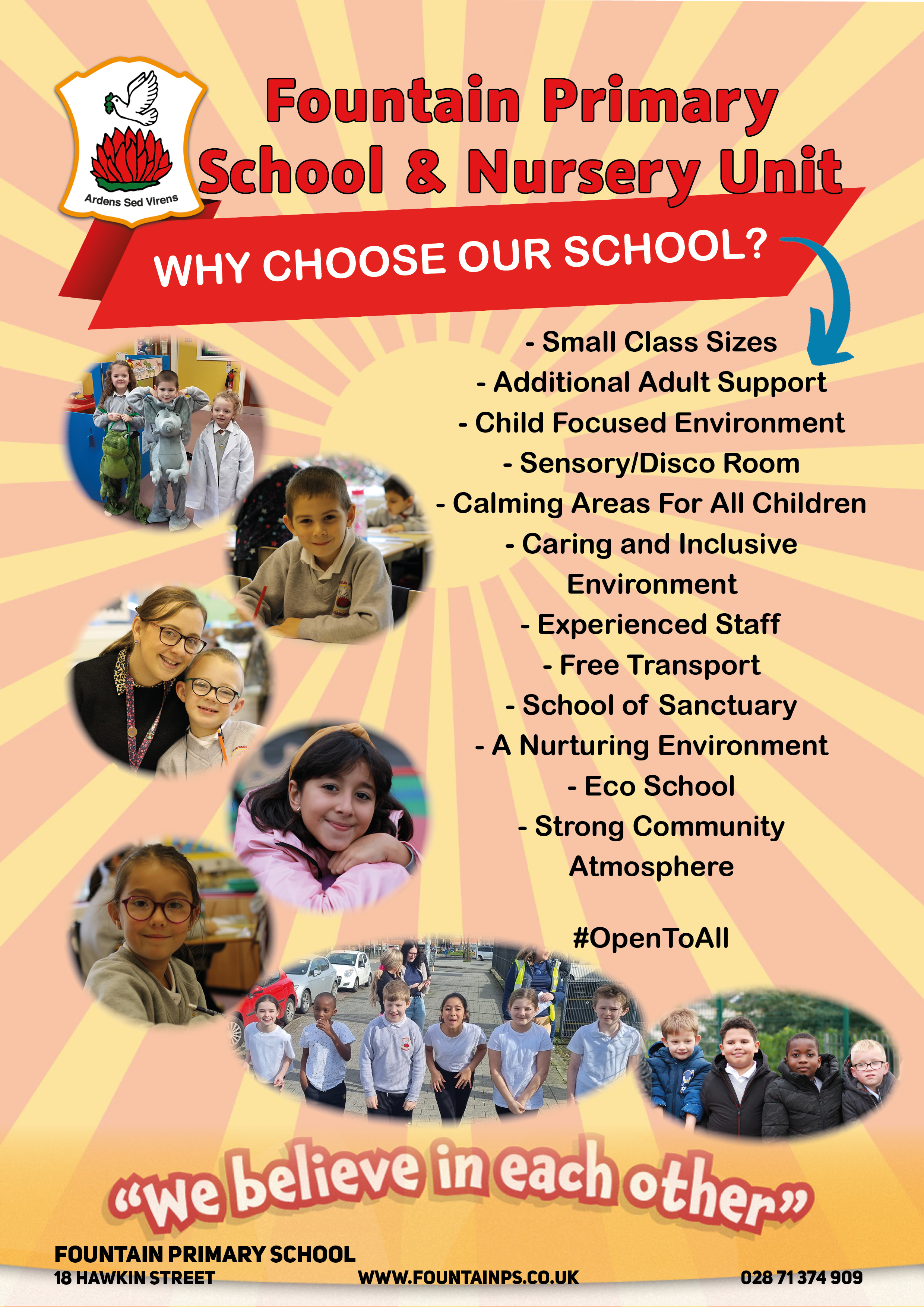 Fountain Primary School is a Controlled Primary School with a Christian Ethos where everyone is welcome! We are a small school based in the city centre and strive to provide a holistic education for all of our children. Our focus is not only on your child's academic achievements but their social and emotional well-being. We nurture our children to ensure that they are given all the tools they need to be able to learn in a caring environment.